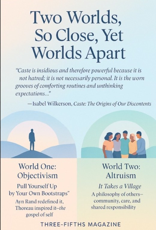 Anchored by a poignant quote from Isabel Wilkerson’s Isabel Wilkerson, the May Edition lays out a stark but illuminating contrast between two dominant philosophies: Objectivism, the self-reliant worldview espoused by thinkers like Ayn Rand and Thoreau, and Altruism, the community-centered ethic rooted in the idea that it “takes a village.”